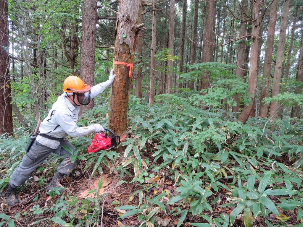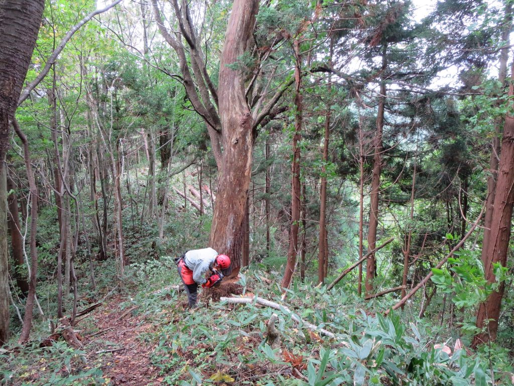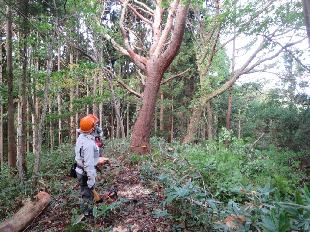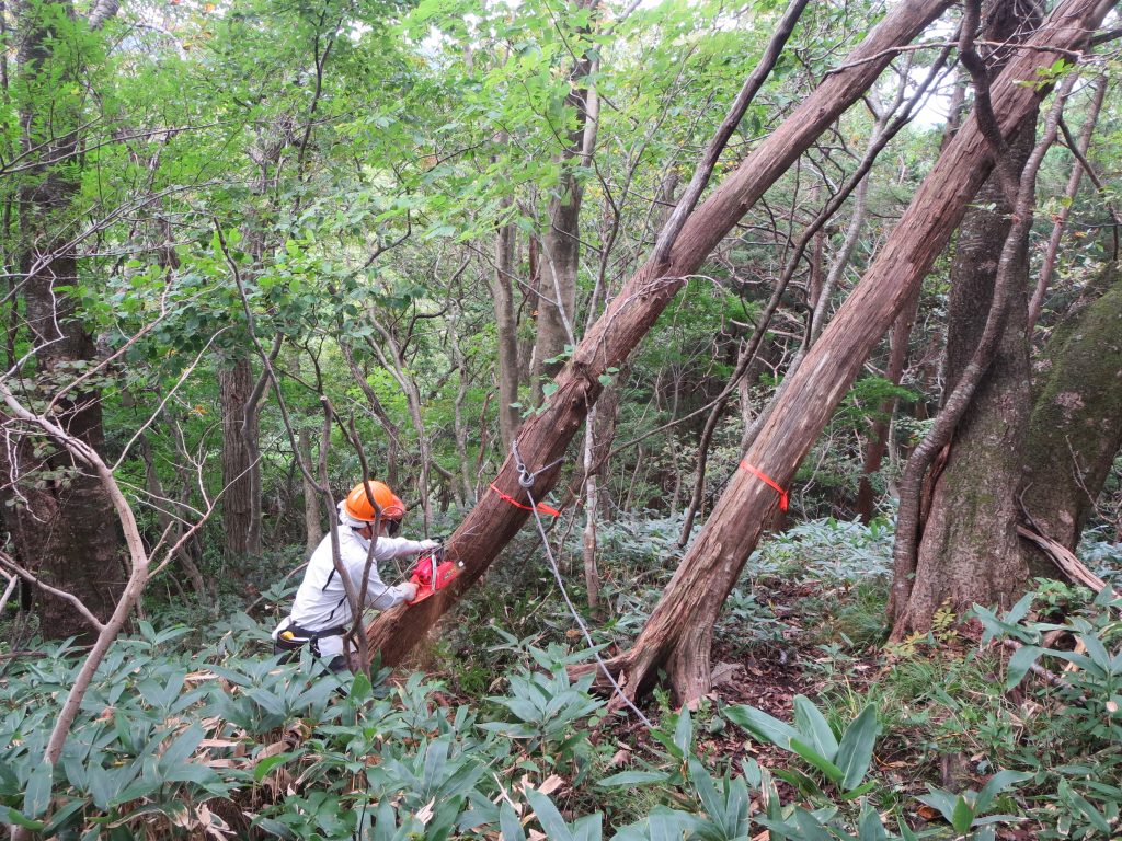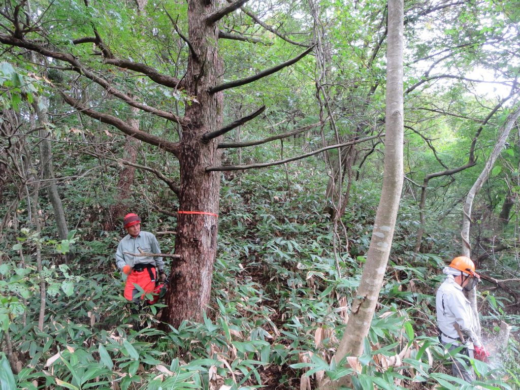 10月19日(日)、秋や今後の学習会などに向けて、危険木の伐採チームが二口ルートに入りました。4月に現地の事前調査を行い目印を付けた危険木の伐採にかかりました。作業前には熊対策として花火を打ち上げました。作業にはプロフェッショナルの出羽庄内森林組合の組合員のご協力を頂きました。いつもご協力頂き感謝感謝です。この作業は「やまがた緑環境税」活用して行いました。「やまがた緑環境税」を納めて頂いている県民の皆様にも感謝申し上げます。松枯れなどによる枯れ木は我々が行う学習会の参加者の安全を確保する為にも以前からの課題でした。この度の伐採で少しは解決できたかなと思います。ただ、伐採作業より松枯れなどによる危険木が進んでいるのが現状です。我々はこれからも学習会に参加して下さる方や、藤倉山に来て下さる方の安全を確保する為に頑張って行きます。そして、地域に恵みをもたらす藤倉山の環境を次世代に引き継ぐためにも頑張って行きます。