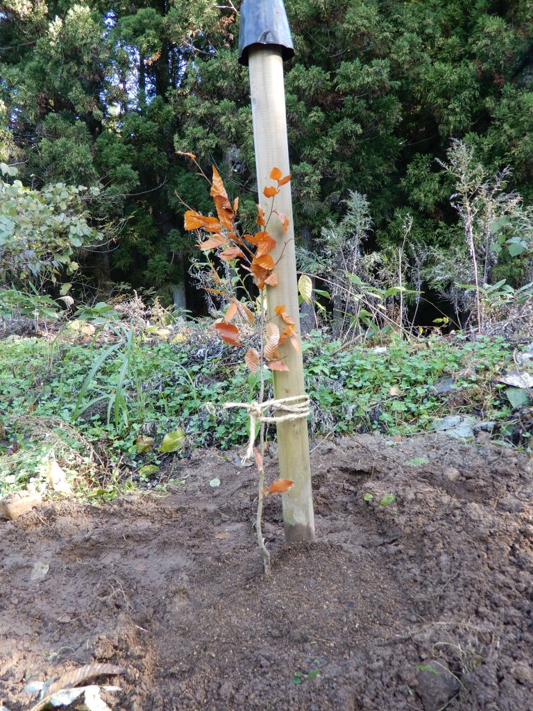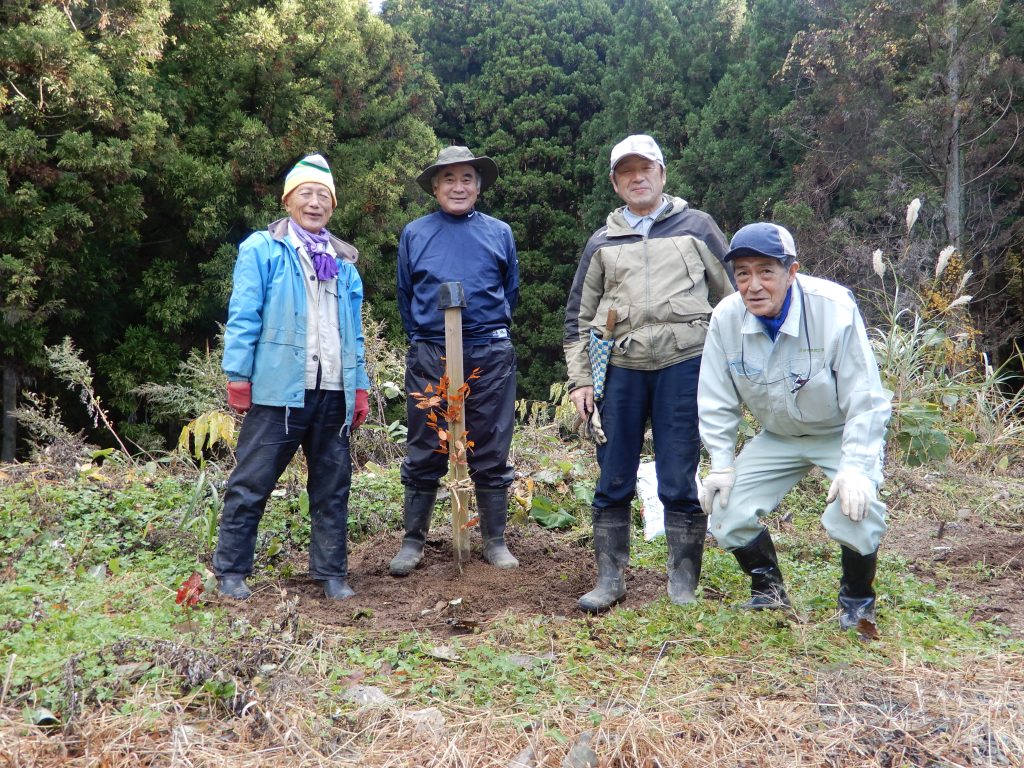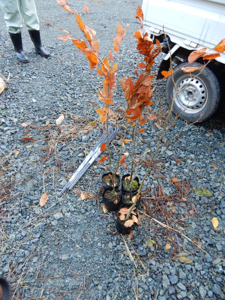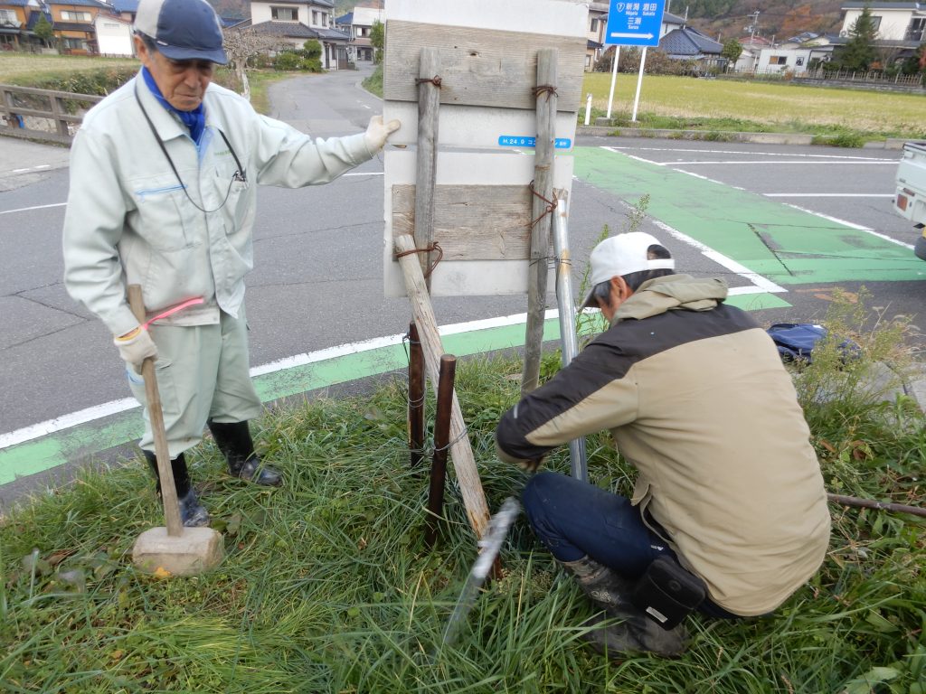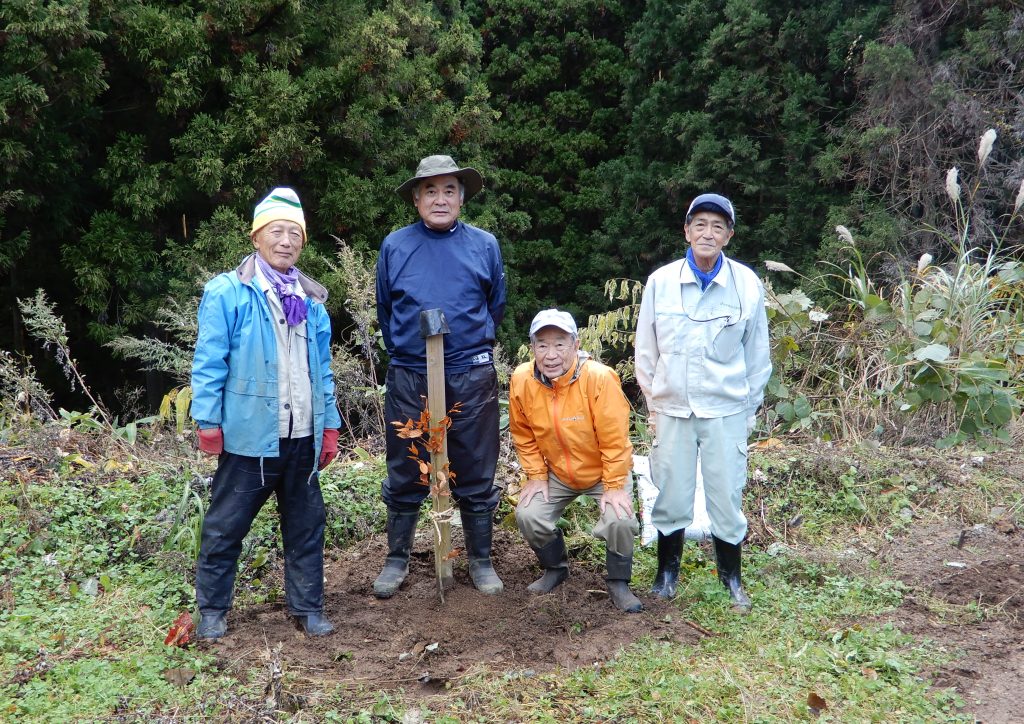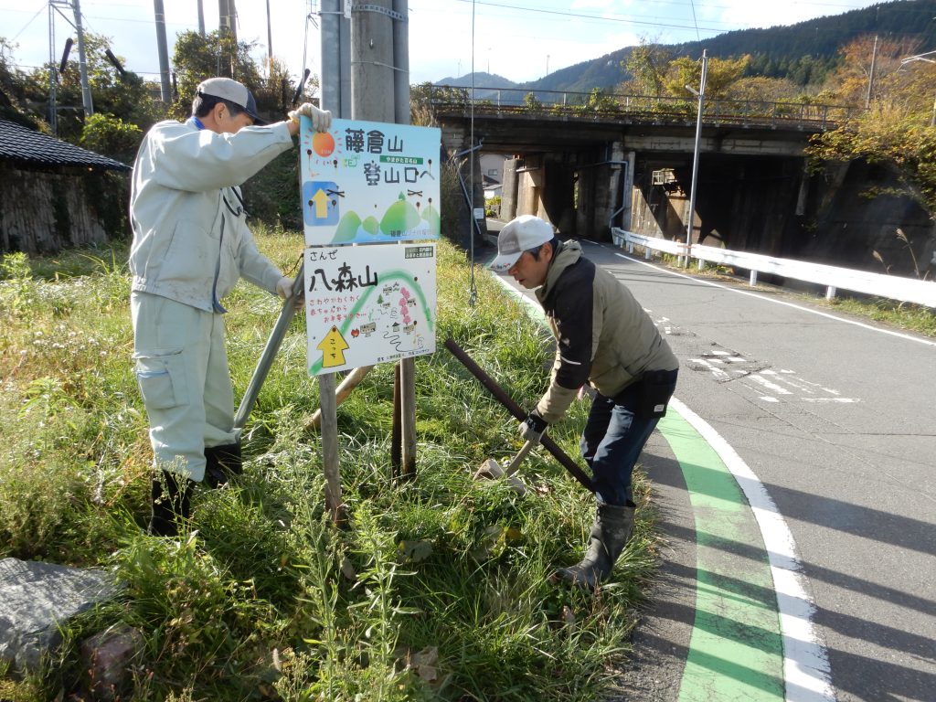 11月14日(金)、11月9日に植樹のために整備した、二口登山口駐車場にブナの苗木を植えました。昨年植えたナラの木で、枯れた苗木もあったので、その苗木に使用していた杭を再利用して植樹しました。日を改めて、三瀬保育園児に植樹の仕上げをして頂きます。子供たちの喜んで手伝ってくれるのが楽しみです。この活動は(公財)やまがた森林と緑の推進機構の助成金を活用して行いました。作業後には八森山スキー場から紅葉真っ盛りの藤倉山を眺めました。最後に三瀬地区に設置してある「藤倉山 案内看板」の補修を行いました。