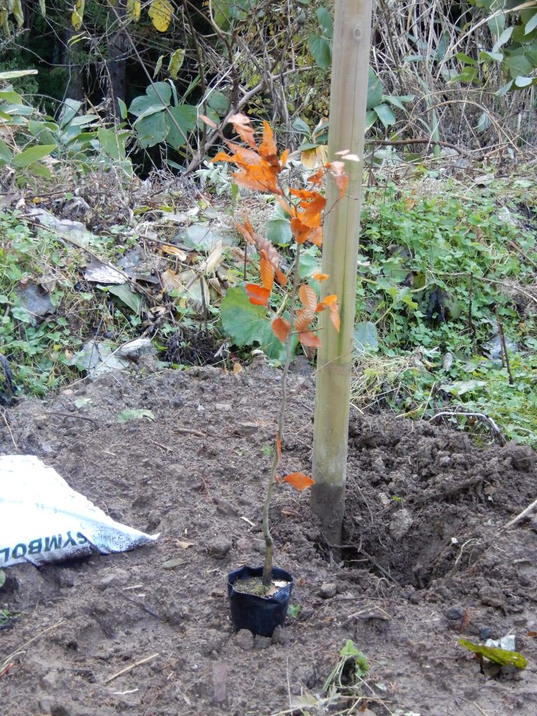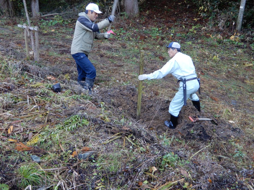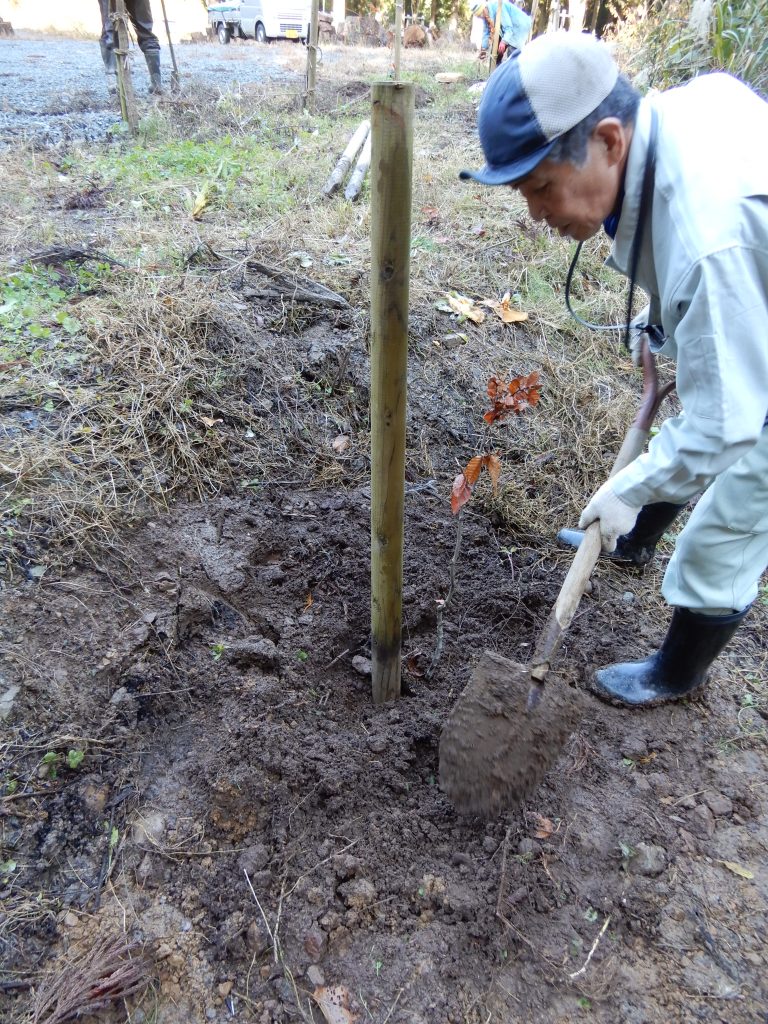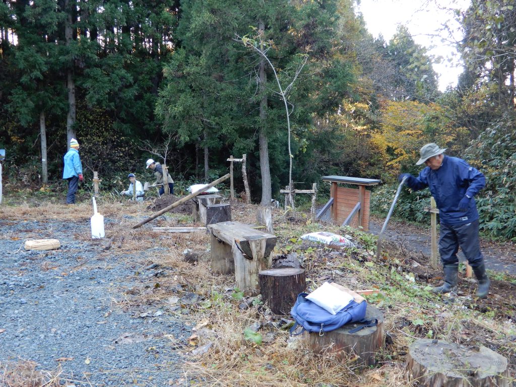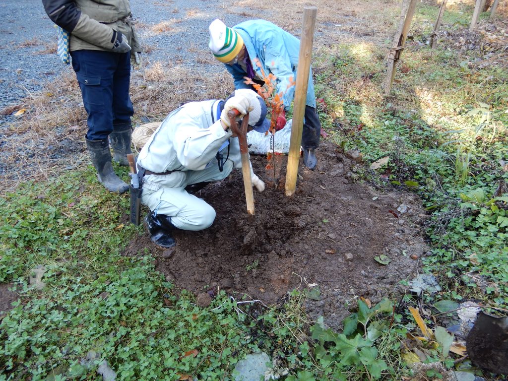 11月14日(金)、11月9日に植樹のために整備した、二口登山口駐車場にブナの苗木を植えました。昨年植えたナラの木で、枯れた苗木もあったので、その苗木に使用していた杭を再利用して植樹しました。日を改めて、三瀬保育園児に植樹の仕上げをして頂きます。子供たちの喜んで手伝ってくれるのが楽しみです。この活動は(公財)やまがた森林と緑の推進機構の助成金を活用して行いました。作業後には八森山スキー場から紅葉真っ盛りの藤倉山を眺めました。最後に三瀬地区に設置してある「藤倉山 案内看板」の補修を行いました。